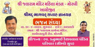 મોરબીના જલારામ મંદિરમાં શુક્રવારે ભજન સંધ્યા યોજાશે