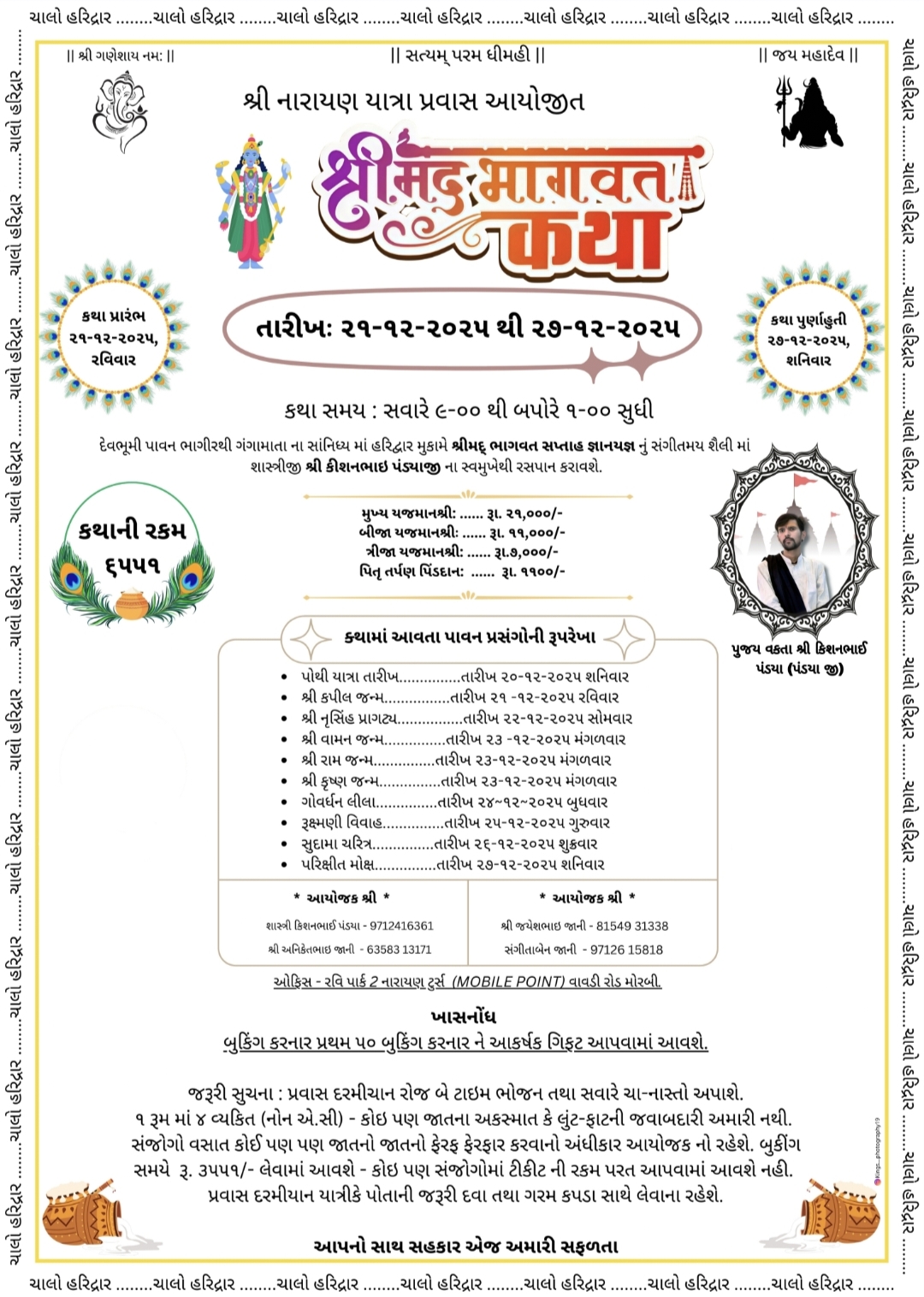 દેવભૂમી પાવન ભાગીરથી ગંગામાતા ના સાંનિધ્ય માં હરિદ્વાર મુકામે શ્રીમદ્ ભાગવત સપ્તાહ જ્ઞાનયજ્ઞ નું સંગીતમય શૈલી માં શાસ્ત્રીજી શ્રી કીશનભાઈ પંડ્યાજી ના સ્વમુખેથી રસપાન કરાવશે.